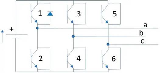 有刷直流電機使用機械換向,無刷直流電機與此不同,采用電子換向。這意味著電機的相位,根據(jù)轉(zhuǎn)子相對于定子的位置依次通電和斷電。對于三相無刷直流電機,驅(qū)動器由六個電子開關(guān)(通常為晶體管)組成,通常稱為三相H 橋(圖1)。此配置允許三個雙向輸出,為電機的三相通電。