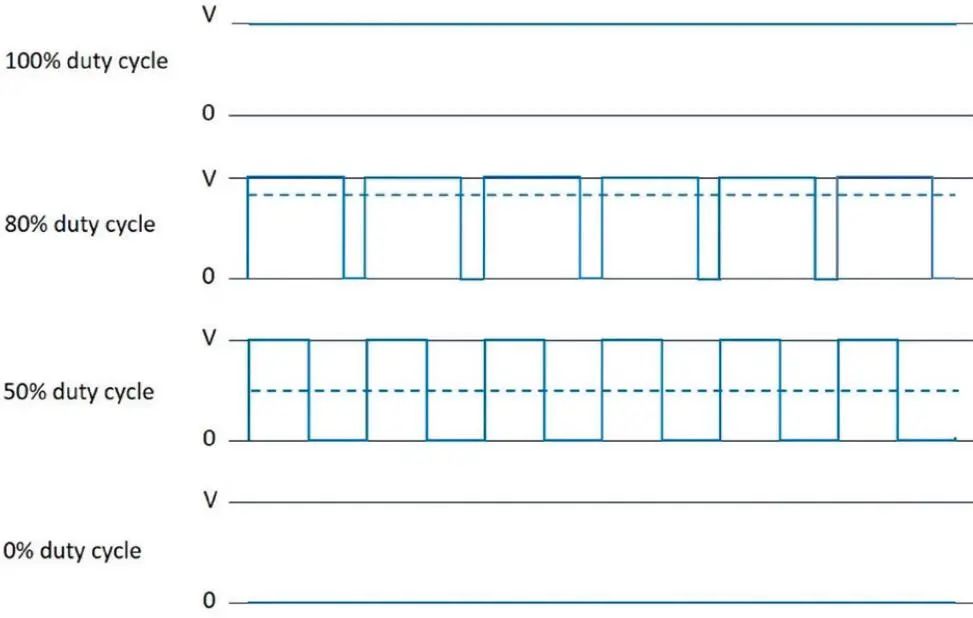 圖 7 :不同的 PWM 占空比。所有工況下的頻率都是相同的,而平均電壓(虛線)與占空比成比例。