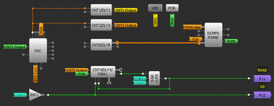 參照圖3中GreenPAK內(nèi)部的可配置單元圖示,PWM信號是使用PWM0和相應(yīng)時鐘脈沖發(fā)生器(CNT8/DLY8)生成的。由于脈沖寬度是用戶可控的,我們使用FSM0(可以連接到PWM0)來統(tǒng)計用戶數(shù)據(jù)。