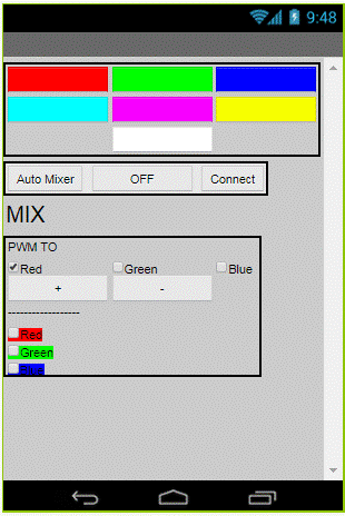 在本節(jié)中,我們將創(chuàng)建一個安卓應(yīng)用程序,它將監(jiān)測和顯示用戶的控件選擇。界面由兩部分組成:第一部分包含一組具有預(yù)定義顏色的按鈕,因此當按下這些按鈕中的任意一個時,相應(yīng)顏色的LED會亮起。第二部分(MIX方塊)為用戶創(chuàng)建混合顏色。