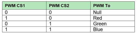 在第一部分,用戶選擇他們希望PWM信號通過的LED引腳;PWM信號一次只能傳遞到一個引腳。下面的列表在PWM模式期間邏輯地控制其他兩種顏色的開/關(guān)。