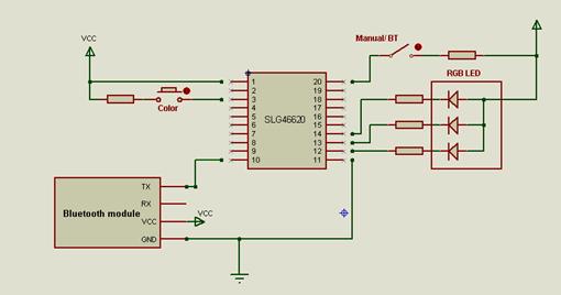 為了創(chuàng)建這個項目,我們將使用SLG46620 GreenPAK IC、一個藍牙模塊和一個RGB LED。
