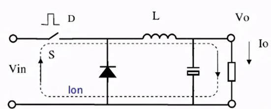 當(dāng)開(kāi)關(guān)導(dǎo)通時(shí):輸入電壓Vin加到LC濾波器的輸入端,電感上的電流以固定斜率線性上升。如下圖