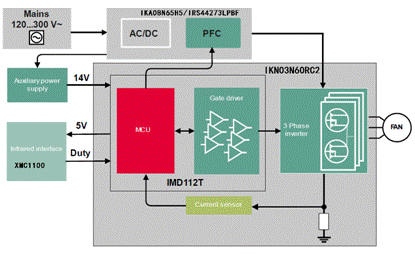 本方案是一套完整的參考設(shè)計(jì),包括一塊主板和一塊帶IrDa傳感器的子卡以及一個(gè)匹配的遙控盒。主板的核心為IMD112T iMOTION™電機(jī)控制智能驅(qū)動器,該驅(qū)動器集成了電機(jī)控制器、高壓三相柵極驅(qū)動器和電壓調(diào)節(jié)器。并且系統(tǒng)利用經(jīng)過現(xiàn)場認(rèn)證的運(yùn)動控制引擎(MCE)提供現(xiàn)成的PFC和電機(jī)控制器,因此解決了吊扇電機(jī)控制算法開發(fā)過程中的軟件編碼,減少了設(shè)計(jì)時(shí)間。