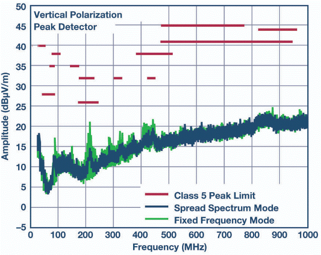 有關(guān)排放輸出特性,請(qǐng)參見圖4。這種改進(jìn)的EMI/EMC性能對(duì)電路板布局不敏感,即使在使用2層PC板時(shí)也能簡(jiǎn)化設(shè)計(jì)并降低風(fēng)險(xiǎn)。LT8645S可在整個(gè)負(fù)載范圍內(nèi)輕松通過汽車CISPR 25,5類峰值EMI限制。擴(kuò)頻頻率調(diào)制也可用于進(jìn)一步降低EMI水平。