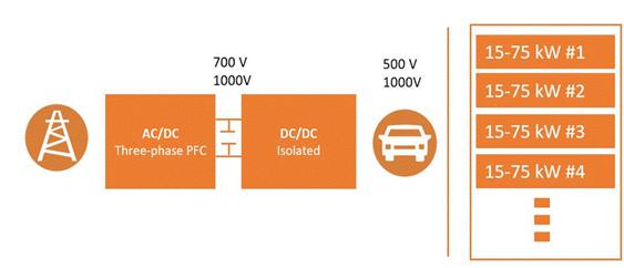 SiC-模塊代表了上述DC-DC電源轉(zhuǎn)換級(jí)中全橋的一個(gè)非常合適和常見(jiàn)的解決方案,功率高于15 kW。更高的頻率有助于縮小變壓器和電感器的尺寸,從而縮小整個(gè)解決方案的外形尺寸。