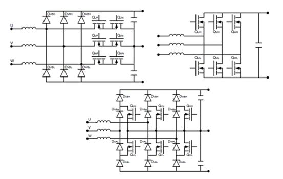 圖2.用于DCFC的典型PFC升壓拓?fù)浣Y(jié)構(gòu).T-NPC(左上)、6開(kāi)關(guān)(右上)和I-NPC(底部)