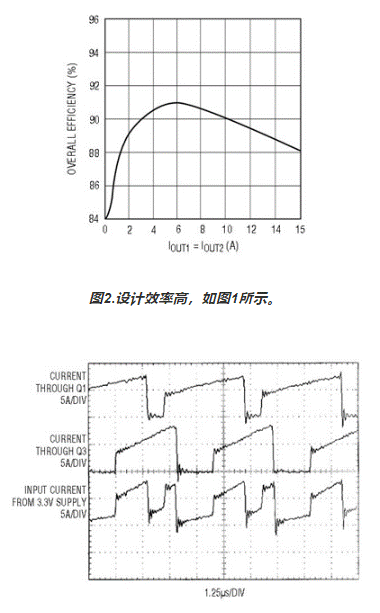圖1.LTC1876 設(shè)計(jì)可在 15A 和 15A 時將 3.3V 轉(zhuǎn)換至 2.5V,在 15A 時轉(zhuǎn)換 1.8V。