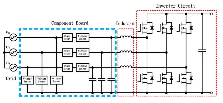 組件板,基于九個三相電容器(B32774D8126K000,12 μF)、三個電壓傳感器(RP1215D)、三個電流傳感器(CKSR 25-NP)和三個功率繼電器(T9SV1K15-12)