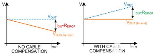 位于中控臺(tái)上或后排乘客座椅附近的 USB 端口使用長(zhǎng)電纜連接到電源轉(zhuǎn)換器的輸出。該電源轉(zhuǎn)換器存在于儀表板的信息娛樂(lè)主機(jī)中。充電時(shí),在 USB 插座上的電纜末端觀察到壓降,因?yàn)檫@些電纜的電阻有限。例如,輸出電壓為5V,電流為5A,在100m?電纜在插座處具有 500mV 壓降。這違反了USB (3.0)標(biāo)準(zhǔn),該標(biāo)準(zhǔn)要求連接器電壓在±250mV范圍內(nèi)(±5%)。在負(fù)載瞬變期間以及器件連接或斷開(kāi)時(shí),插座上觀察到較大的電壓擺幅。通過(guò)實(shí)施壓降補(bǔ)償可以解決這個(gè)問(wèn)題,其中功率轉(zhuǎn)換器的輸出電壓與輸出電流成比例增加,如圖4所示?刂品桨赴ㄕ答,其中電壓增加以增加電流,這經(jīng)常出現(xiàn)穩(wěn)定性挑戰(zhàn)。這種方法用于補(bǔ)償由于PCB走線和連接器的電阻引起的壓降。這在設(shè)備端提供了準(zhǔn)確的充電電壓。此外,增加一個(gè)檢測(cè)電阻以檢測(cè)輸出電流會(huì)產(chǎn)生額外的壓降和功率損耗。此外,壓降補(bǔ)償在負(fù)載瞬變期間引入較大的壓降。長(zhǎng)電源線除了電阻外,還包括電感,這會(huì)導(dǎo)致快速負(fù)載瞬變期間的壓降很大。