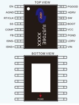 1、采用IU5706高效同步升壓控制器。此芯片4.5V-24V輸入電壓(涵蓋2-5節(jié)鋰電、鉛酸電池作為電源的應(yīng)用),輸出電壓最高36V,并且能夠為負載提供8A持續(xù)電流,效率高達96%,采用EQA-16封裝。