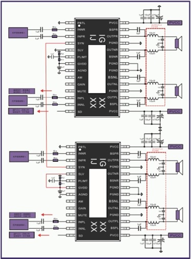 3、IU5706支持12V升壓至24V,給兩顆IU8689供電,輸出4x65W/4歐 ( THD+N=1%);IU8689主從模式可實現(xiàn)多顆芯片無限級聯(lián)功率輸出,此應(yīng)用非常適合車載音頻后裝市場。