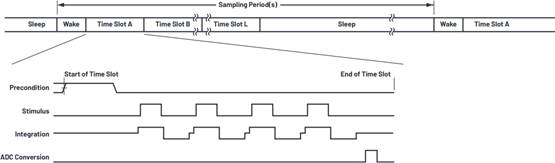 圖 3a 顯示了如何支持時隙操作。每個時隙從前置條件脈沖開始,然后是刺激脈沖,最后是光電二極管電流或來自ADC采樣的另一個傳感器信號的信號。