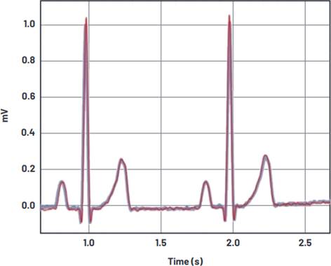 圖4.用不同的電極測量兩個ECG波形。
