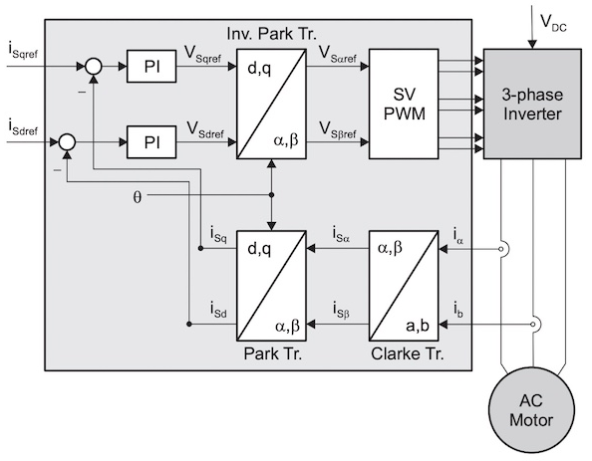 三相逆變器的輸出產(chǎn)生正弦信號(hào),該信號(hào)通過克拉克變換和派克變換進(jìn)行采樣和饋送。