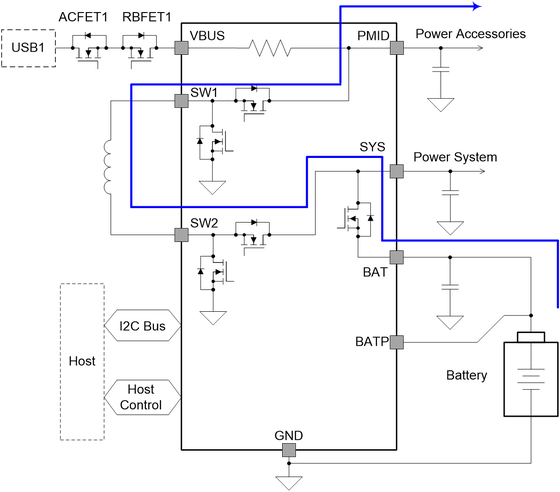 圖 3所示的完全集成的升降壓充電器可以簡化 USB PD 充電解決方案的系統(tǒng)范圍設(shè)計。作為輸入過壓和過流保護(hù)電路的一部分,外部背對背 MOSFET 的控制邏輯和驅(qū)動電路也集成到充電器中。這些功能消除了框圖中支持輸入電源路徑管理和輸入電流檢測的單元。