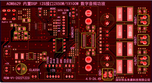 | ACM8629 單聲道100W/立體聲50W內(nèi)置DSP音頻算法的I2S數(shù)字輸入D類功放IC解決方案 |