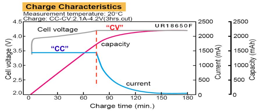 使用類似BQ4725A這類集成的充電管理芯片方案對鋰電池充電其實(shí)十分簡單。鋰電池直接連接到充電控制芯片BQ24725A的BAT管腳上,配置充電控制芯片的Charge Voltge,Charge Current,以及保護(hù)功能的Input Current Limit,使能充電功能即可。Charge Voltage(VCHG)是電芯的最大滿充電壓,Charge Current (ICHG) 是電芯允許的最大充電電流。典型的鋰電池充電特性如下圖所示,分為CC(Constant current)和CV(Constant Voltage) 兩個(gè)階段。CC階段恒定以最大充電電流持續(xù)對電池進(jìn)行充電,此時(shí)單位時(shí)間充入電池的電量是恒定的Q=ICHG*T。隨著電池充入電量越來越多,電池電壓會上升,當(dāng)電壓上升到最大滿充電壓時(shí)候,充電芯片將控制輸出電壓為恒定的最大滿充電壓,此時(shí)電流開始逐漸減小,充入電量的增加速度慢慢減慢,總充入電量仍然在增加。直到電流減小到截止電流點(diǎn),充電芯片停止充電,鋰電池達(dá)到充滿狀態(tài)。