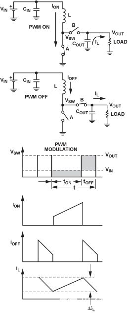 請注意,開關穩(wěn)壓器操作可以是連續(xù)的,也可以是不連續(xù)的。在連續(xù)導通模式(CCM)下工作時,電感電流永遠不會降至零;在非連續(xù)導通模式(DCM)下工作時,電感電流可能降至零。電流紋波,顯示為 Δ我L在圖2中,使用Δ我L = (V在× 噸上)/L. 平均電感電流流入負載,而紋波電流流入輸出電容。
