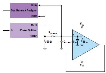 圖1.在運(yùn)算放大器輸入端增加串聯(lián)電阻之后,可以測(cè)量運(yùn)算放大器的輸入電容。