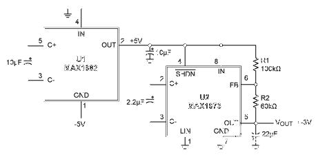U1 (MAX1682)作為倍壓器工作,接受5V負輸入并產生5V正輸出。穩(wěn)壓反相器(U2,MAX1673)接受+5V電壓并產生-3V輸出。U2輸出端的分壓器(R1/R2)提供反饋,將U2的輸出電壓調節(jié)到所需水平(V外).在FB輸入端,閾值電壓出廠設置為零。您可以使用 R2(5V/R1) = -V 選擇 R1 和 R2 的值外,再加上它們的總和應允許最小電流為 50μA 的條件。V的精度外很大程度上取決于-5V輸入的精度。圖2和圖3顯示了-4.75V、-5V和-5.25V輸入的電路效率和輸出調節(jié)。