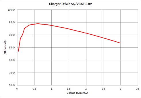 • 高效率3A同步降壓充電(配合2520封裝,1μH, 30mΩ DCR電感, VBUS 5V)