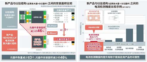 近年來,越來越多的應(yīng)用產(chǎn)品需要具備電流檢測功能。例如,要想改善電機(jī)效率和實(shí)現(xiàn)異常檢測等目標(biāo),就需要提高電流檢測精度。另外,還需要減少安裝面積。在以往結(jié)構(gòu)(運(yùn)算放大器+分立器件)中,存在元器件精度波動和溫度特性導(dǎo)致電流檢測精度下降、很難縮小安裝面積等問題。為了解決這些問題,ROHM利用長年積累的模擬技術(shù)優(yōu)勢,開發(fā)出更節(jié)省空間且能高精度檢測電流的新產(chǎn)品“BD1421x-LA系列”。