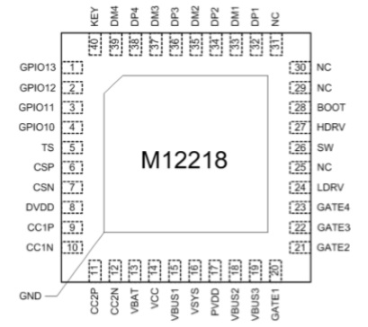 M12028是一款面向小家電、電動工具、戶外藍牙音箱等充電的快充管理SOC,集成了同步開關(guān)電壓變換器、快充協(xié)議控制器、電池充放電管理、電池電量計算等功能模塊,支持PD3.0、PD2.0、QC3.0、QC2.0、BC1.2 DCP、UFCS快充充電協(xié)議,額定充電功率100W,并提供輸入過壓/欠壓、電池過充、過溫、過流等完備的保護功能。搭載極簡的外圍電路,即可組成2-4節(jié)電池的快充充電解決方案。 |