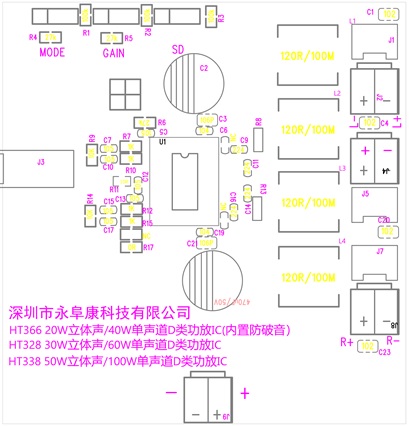 深圳市永阜康科技有限公司大力推廣最新20W、30W、50W雙聲道D類功放IC系列-HT366/HT328/HT338,可充分滿足藍牙音箱、聲霸音箱、便攜式音頻播放器及液晶電視 (LCD TV) 等應(yīng)用。工作電壓范圍覆蓋4.5V-26V,全系列產(chǎn)品管腳兼容,工程師可透過重復(fù)使用同一PCB不同功率無縫切換,以節(jié)省成本及縮短開發(fā)周期。