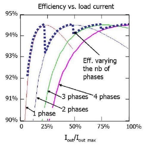 在低負(fù)載電流下,單相可實現(xiàn)效率,但隨著電流增加,效率終會降低,直到系統(tǒng)以兩相更高效地運行。這種模式一直持續(xù)到所有階段都處于活動狀態(tài)時達(dá)到效率。因此,即使由于高負(fù)載電流要求而并非嚴(yán)格需要多相,多相方法也帶來了提高效率的可能性,尤其是在電流消耗變化很大的系統(tǒng)中。
