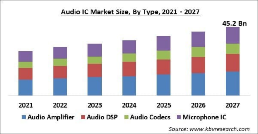 2021年,全球音頻芯片市場(chǎng)的收入規(guī)模為298.83億美元。隨著消費(fèi)者對(duì)于音質(zhì)要求的逐漸提高,個(gè)人便攜式電子產(chǎn)品、智能終端電子產(chǎn)品的更新?lián)Q代,無(wú)線音箱的市場(chǎng)需求在逐步提升,受下游市場(chǎng)多元化需求的拉動(dòng),相應(yīng)的音頻芯片需求也在逐步提升。根據(jù)Reportlinker預(yù)測(cè),2022年至2027年,全球音頻驅(qū)動(dòng)器IC市場(chǎng)將增長(zhǎng)31.28億美元,在預(yù)測(cè)期內(nèi)以15.86%的復(fù)合年增長(zhǎng)率加速增長(zhǎng)。