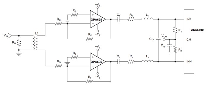 下圖顯示了一個(gè)示例應(yīng)用,其中兩個(gè)單端信號(hào)路徑用于創(chuàng)建到 ADS5500 的差分接口,ADS5500是TI 的 14 位、125-MSPS 模數(shù)轉(zhuǎn)換器。