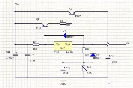 4、也可以使用LM317線性可調(diào)三端穩(wěn)壓器實現(xiàn)。其輸出電流1.5A,若電流不夠時,可以使用三極管進(jìn)行擴(kuò)流,其原理如下圖所示。