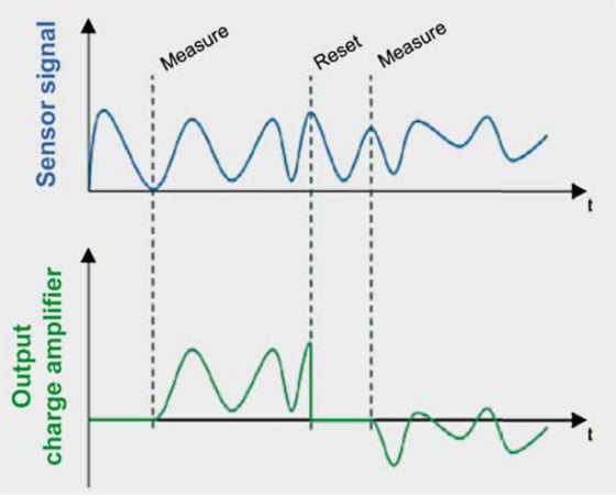 同樣,上部曲線顯示傳感器產(chǎn)生的電荷,下部曲線描述電荷放大器的輸出。請注意,當(dāng)開關(guān)打開時(shí),輸出為零。結(jié)果,復(fù)位開關(guān)也為隨后的測量固定了零點(diǎn)。