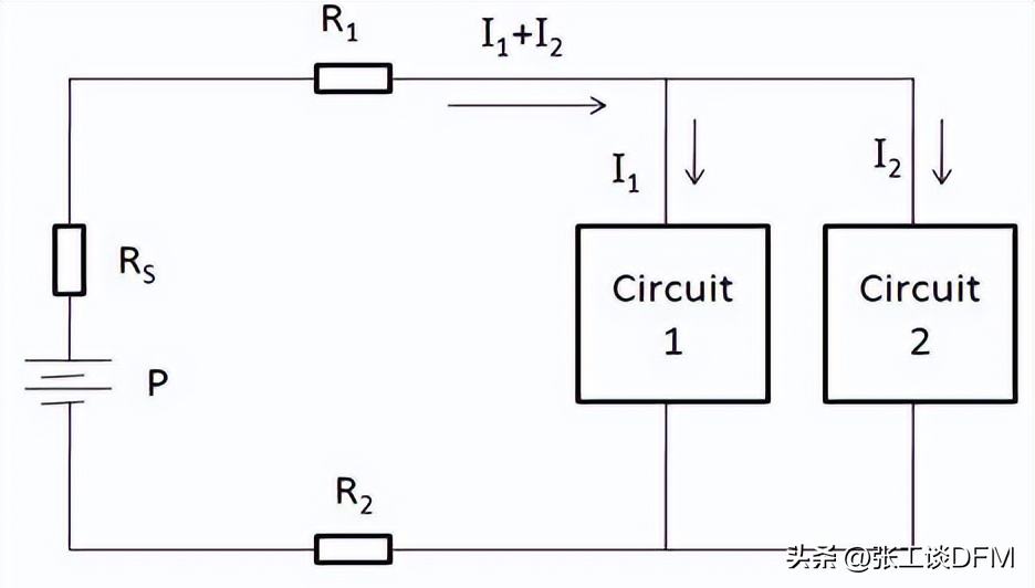 下圖顯示了通過共模阻抗進(jìn)行的噪聲去耦。電路1和電路2通過同一根導(dǎo)線獲得電源電壓的和接地環(huán)路。如果其中一個(gè)電路的電壓突然需要提高,另一個(gè)電路將降低,因?yàn)楣搽娫春蛢蓚(gè)回路之間的阻抗。