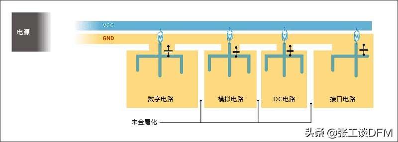 下圖說明了如何使用分段將四個(gè)不同的電路分開。地平面使用未金屬化的護(hù)城河/通道有效地隔離了電路。電感和電容對每個(gè)電路進(jìn)行濾波,電源層之間的耦合減少。
