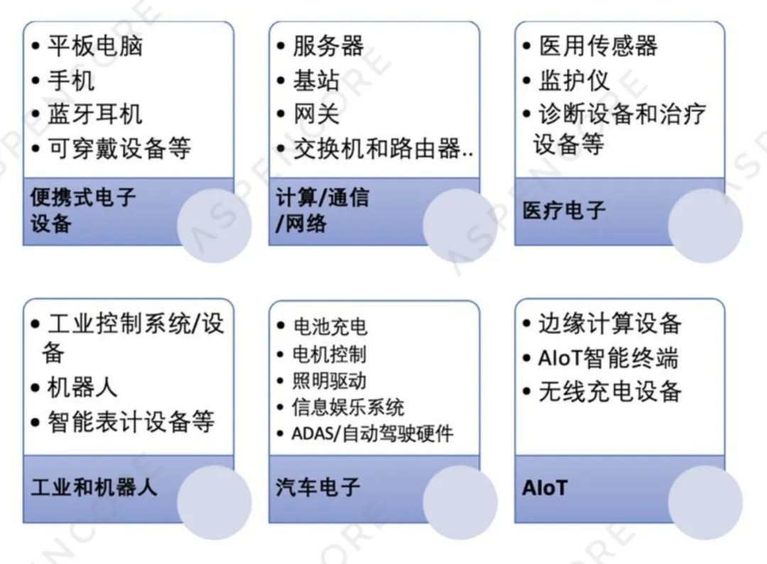 關鍵應用:筆記本及平板電腦、智能可穿戴設備、電動工具、充電類產品、輕型電動車輛、智能家電、智能手機、無人機等。