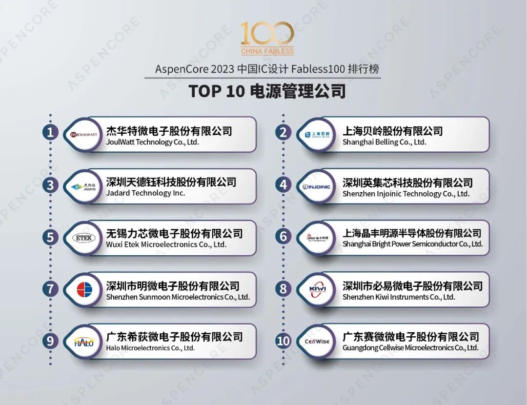 入選2023年中國IC設計Fabless100排行榜的Top 10 電源管理芯片(PMIC)公司