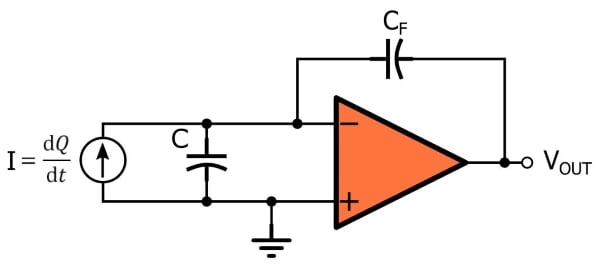 跨阻放大器接受輸入電流并將其乘以反饋路徑中的電阻,這不僅會(huì)增加幅度,還會(huì)將電流轉(zhuǎn)換為電壓。電荷放大器做類似的事情,但在反饋路徑中使用電容而不是電阻產(chǎn)生的輸出不與瞬時(shí)電流成比例,而是與電流隨時(shí)間的累積成比例。換句話說,輸出告訴我們一些關(guān)于電流積分(相對于時(shí)間)的信息,而不是給定時(shí)刻電流的大小。