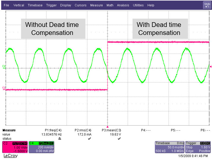 圖 6:實施 PWM 調(diào)制和死區(qū)時間補償來優(yōu)化 MCF8316A 聲學性能