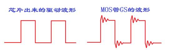 測(cè)試MOS管GS波形時(shí),有時(shí)會(huì)看到下圖中的這種波形,在芯片輸出端是非常好的方波輸出,但一旦到了MOS管的G極就出問題了,有振蕩,這個(gè)振蕩小的時(shí)候還能勉強(qiáng)過關(guān),但是有時(shí)候振蕩特別大,看著都教人擔(dān)心會(huì)不會(huì)重啟。