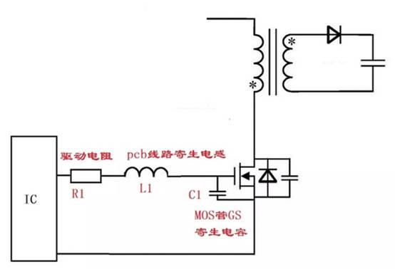 IC出來(lái)的波形正常,到C1兩端的波形就有振蕩了,實(shí)際上這個(gè)振蕩就是R1,L1和C1三個(gè)元器件的串聯(lián)振蕩引起的,R1為驅(qū)動(dòng)電阻,是我們外加的,L1是PCB上走線的寄生電感,C1是mos管gs的寄生電容。