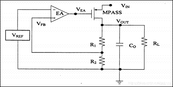 如今的LDO電路具有體積小,噪聲低,功耗低,價格低廉,使用方便等特點,但其基本的結構比較簡單,包含了電壓基準源(VREF),誤差放大器(EA),調整管(MPASS),反饋電阻(Rl,R2)四個模塊,如下圖所示。其中: