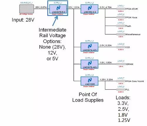 圖 12—表明輸入、中間軌、負(fù)載點 (POL) 電源和負(fù)載的電源系統(tǒng)。中間軌電壓的不同選擇為 28V(直接使用輸入電源)、12V 和 5V。這會帶來不同的 POL 穩(wěn)壓器占空比。