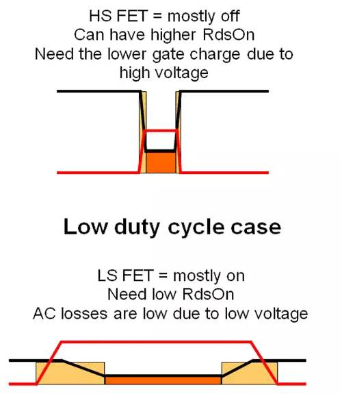 低占空比設(shè)計意味著高輸入電壓,對這些設(shè)計而言,高側(cè) FET 大多時候均為關(guān)斷,因此 DC 損耗較低。但是,高 FET 電壓帶來高 AC 損耗,所以可以選擇低柵極電荷的 FET,即使導(dǎo)通電阻較高。低側(cè) FET 大多數(shù)時候均為導(dǎo)通狀態(tài),但是 AC 損耗卻。這是因?yàn)椋瑢?dǎo)通/關(guān)斷期間低側(cè) FET 的電壓因 FET 體二極管而非常地低。因此,需要選擇一個低導(dǎo)通電阻的 FET,并且柵極電荷可以很高。圖 7 顯示了上述情況。