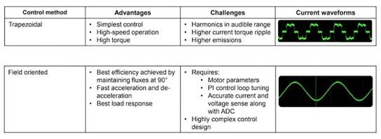 用于控制 BLDC 電機的兩種控制方案各有優(yōu)缺點。每種方法都會產(chǎn)生有助于聲學(xué)噪聲的諧波偽影。