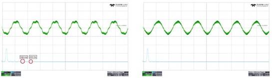 在 MCF8316A 內(nèi)部啟用死區(qū)時間補償可消除可聽諧波(左),從而產(chǎn)生更純凈的正弦信號(右)。截圖由Texas Instruments提供