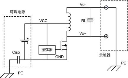 究其原因,如圖1所示,可調(diào)電源對保護(hù)接地線PE實(shí)際上存在電容,以下稱為Ciso,而示波器探頭負(fù)端是接PE的,在高頻下,探頭負(fù)端→PE→Ciso→GND形成一條低阻抗通路。電路的Vo+和Vo-對GND都存在100kHz的電壓,無論探頭負(fù)端接Vo+或Vo-,都產(chǎn)生額外的電流通過探頭負(fù)端→PE→Ciso→GND,在電感的電阻和回路電阻上產(chǎn)生熱量,使電源電流增大,另外并聯(lián)的低阻抗通道改變了驅(qū)動器的諧振狀態(tài)。所以并非是示波器的問題,而是不正確的測量方法導(dǎo)致。