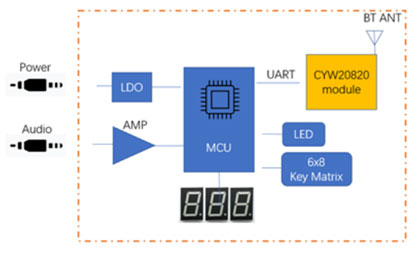 圖示3-大聯(lián)大品佳基于Infineon產(chǎn)品的藍(lán)牙音樂(lè)燈控發(fā)射器方案的方塊圖