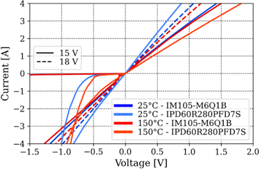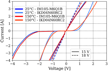 第一個(gè)輸出特性圖如圖2所示?梢钥闯觯诘谝幌笙捱\(yùn)行中,IM105-M6Q1B的壓降大大低于(約4A)IKD04N60RC2的壓降。此外,通常情況下,IM105-M6Q1B的RDS(on)溫度依賴性在Vgs = 15 V時(shí)僅為0.11 mΩ/°C,在Vgs = 18 V時(shí)略高,為0.2 mΩ/℃。這凸顯了CoolSiCTM技術(shù)的溫度依賴性極小的特征。另一方面,在二極管導(dǎo)通期間的第三象限運(yùn)行中,IM105-M6Q1B的壓降高于IKD04N60RC2。然而,請(qǐng)注意,二極管僅在死區(qū)時(shí)間內(nèi)導(dǎo)通,在應(yīng)用條件下,死區(qū)時(shí)間約在0.5到1 µs之間,因此,其造成的損耗微不足道。當(dāng)SiC MOSFET溝道在第三象限運(yùn)行中導(dǎo)通時(shí),壓降略低于第一象限運(yùn)行中的壓降。